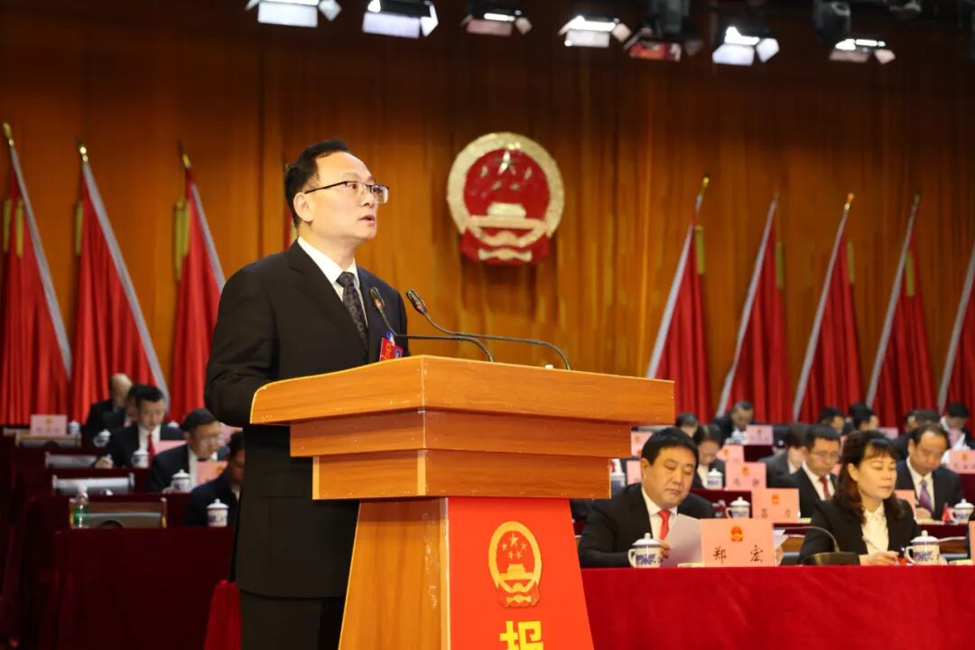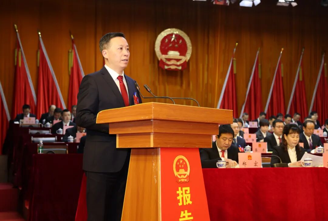 在热烈的掌声中,县长黄东代表县人民政府向大会作政府工作报告。报告共两个部分:2024年工作回顾、2025年重点工作。